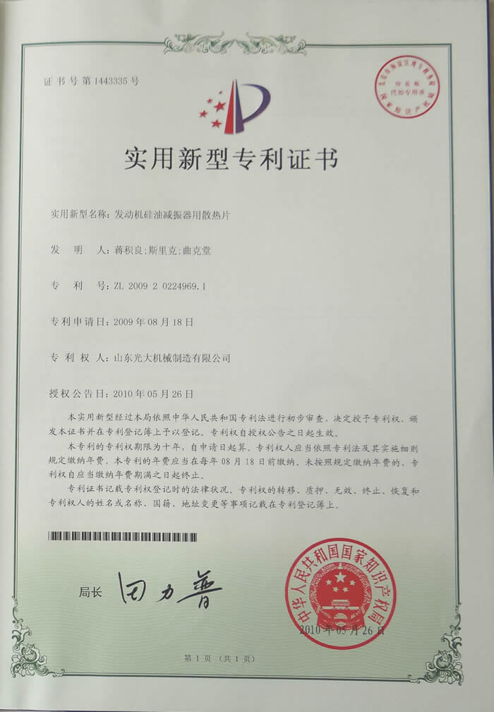 发动机硅油减震器用散热片-实用新型专利证书