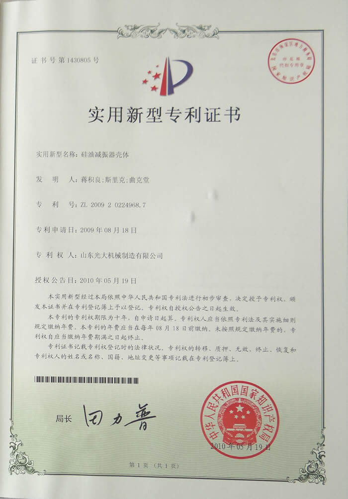 硅油减振器壳体-实用新型专利证书